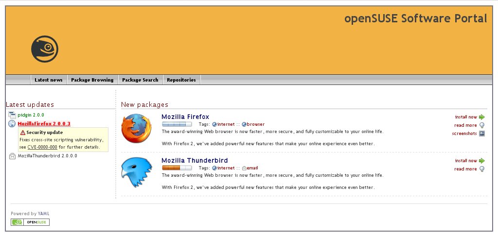 ثانياً: أن يكون نظام يستعمل في أساسه صفحات الويب لكي يسهل إضافة الروابط والمعلومات للبرامج والحزم البرمجية. لقد قام أحد المطورين إسمه Loki بعرض شرح مبدئي مع صورة لهذا النظام أضغط هنا وأيضاً الموقع الرسمي للـ openSuSE قام بوضع صفحة مخصصة لهذا المشروع ممكن متابعتها أضغط هنا