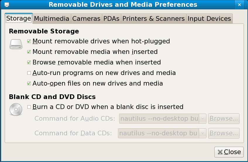 System -> Preferences -> Hardware -> Removable Drives and Media