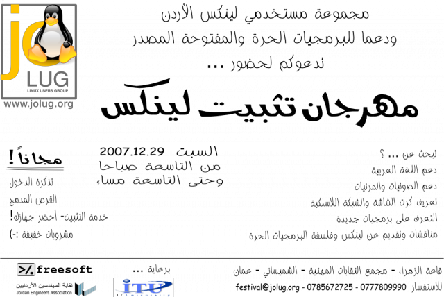 قبل كم يوم ومن خلال الصدفة قلت أمر على موقع مجموعة مستخدمي لينوكس الأردن وأرى ما هي آخر أعمالهم … ﻷن آخر مرة أذكر بإن الموقع شبه مييت والمجموعة ربما لم تعد تلتقي مع بعضها البعض كالسابق والله أعلم … أو على الأقل هذا ما عرفته من خلال السؤال … يوم غد بإذن الله سيكون لهم مهرجان تثبيت لينوكس في عمان الأردن، منطقة الشميساني وبإذن الله سأذهب لحظور هذا المهرجان … أود أن أرى الشباب وأتعرف عليهم بطبيعة الحال وأتعرف على ما يقومون به ويقدموه للناس … وكيف هي الآلية المتبعة في جذب الحضور … عدة أمور أظن يوم غد سأحصل على أجابات عليها …