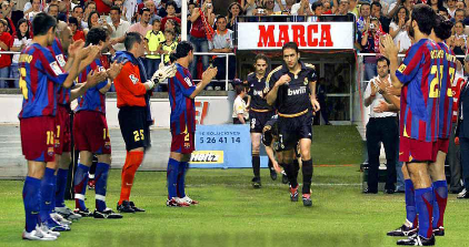 الممر هذا هذه المرة مختلف جداً عن الممر الذي عملوه له في التتويجات السابقة … وذلك ﻷن الممر هذا هذه المرة سيكون مشكل من قبل ﻻعبي برشلونة العدو اللدود للريال الملكي … والممر سيبدأ بالتصفيق كما في الصورة التالية: