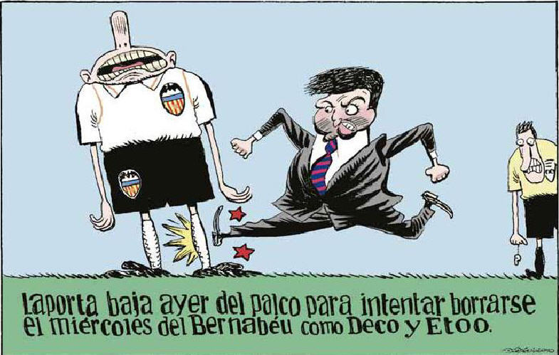 الصورة تتحدث عن قيام رئيس برشلونة خوان لابورتا بضرب أحد ﻻعبي فلنسيا لكي يتم طرده وﻻ يحظر ويجلس بجانب رئيس ريال مدريد كالديرون ويقوم بالتصفيق مع فريقه المكون من الإحدى عشر ﻻعبا للبطل