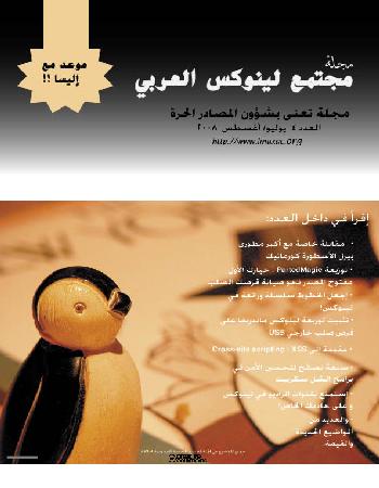 تم بعون الله وحمده الانتهاء من إصدار العدد الرابع الجديد من مجلة مجتمع لينوكس العربي لشهري يوليو- أغسطس 2008 ، وسنقوم بإصدار العدد القادم في شهر سبتمبر 2008 بمشيئة الله وتبقى المجلة دورية تصدر كل شهرين بإذن الله.