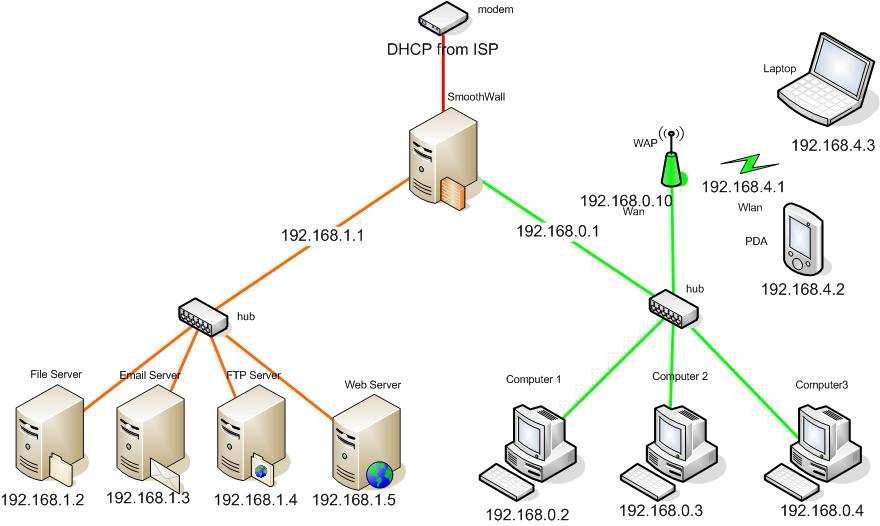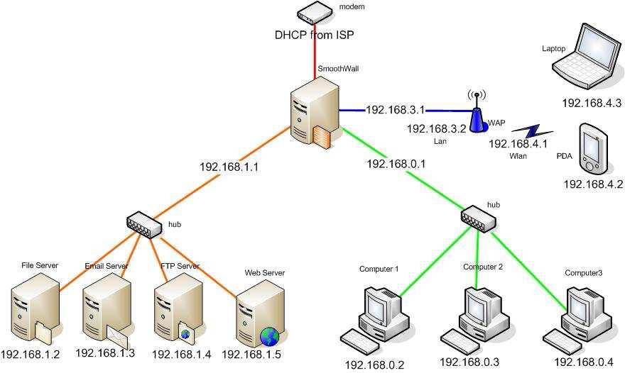 الخيار الثاني: يعني وجود ثلاث كرت شبكة على الجهاز 3NIC’s الأخضر هو الشبكة الداخلية, والبرتقالي هو ال (DMZ) Demetrolized Zone لا علاقة لكم بهذا الخيار ولا مجال لذكر توضيح عليه هنا. الأحمر هنا هو الكارت المربوط على الأنترنت من خلال modem أو ISDN أو ADSL.