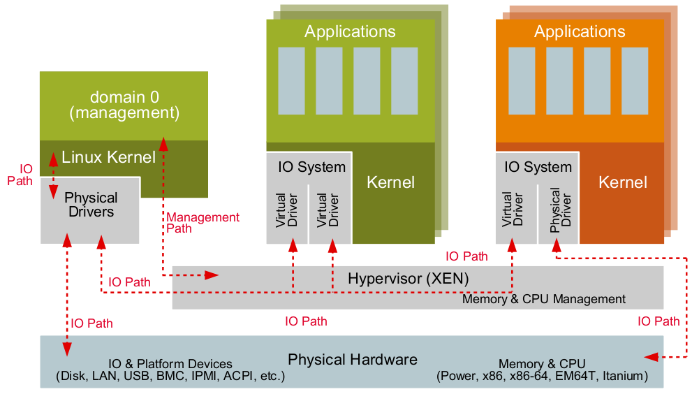 برنامج الـ Virtual Machine Monitor يجب أن يكون يعمل قبل أن نستطيع تشغيل أي نظام تخيلي Virtual Machine. طبعاً عند العمل مع تقنية الـ Xen يسمى الـ Virtual Machine بالدومين Domain. أيضاً هذا البرنامج Virtual Machine Monitor ﻻ يملك مشغلات Drivers للتخاطب مع العتاد Hardware للجهاز المضيف وﻻ يملك منافذ Interface لكي يتم من خلالهم التواصل والتخاطب مع مدير النظام الـ Administrator. هذه الأمور تتم من خلال نظام تشغيل يعمل في الدومين رقم صفر Domain0. حيث يمثل الـ Domain0 المتحكم Controller بالأنظمة الأخرى المستضافة Guests التخيلية. أي بعبارة أخرى هو الذي من خلاله نستطيع أن نتحكم بباقي الأنظمة التخيلية التي تعمل على الجهاز. يتم ذلك كله من خلال خدمة إسمها xend والتي تعمل في الـ Domain0، وهي الخدمة التي تدير جميع الدومينات الأخرى.