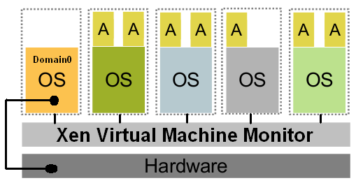 ملاحظة: في عالم الـ Xen يسمى الـ Domain0 بالدومين صاحب الصلاحيات Privileged Domain والذي سيكون هو المضيف Host بينما الدومينات الأخرى التي ليس لها صلاحيات تسمى بالـ DomainU وهي الدومينات الضيف.