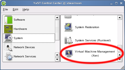 الطريقة الأولى: الآن لتشغيل Xen على جنو/لينوكس كل ما عليك فعله هو تشغيل الـ Yast (الشرح للتنصيب بإستعمال نظام openSUSE كما ذكرنا سلفاً) وبعد ذلك أذهب الى Software وقم بتشغيل الـ Software Management منه. وتأكد من تنصيب الحزم البرمجية التالية :