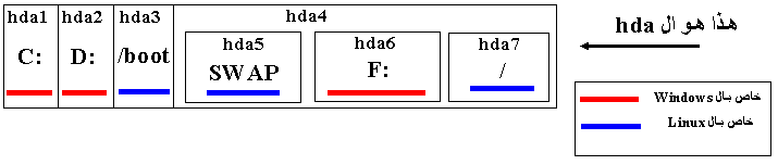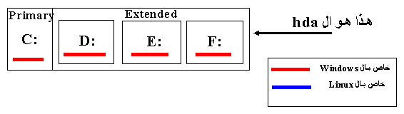 هكذا كله الى الان في الوندوز لم تقوم بالتقسيم على لينكس بعد لكن معرفة هذه الامور هي شيءاساسي قبل ان نخوض في اعماق اللينكس . الان سنكمل الشرح على قرص صلب من نوع hda اي IDE :