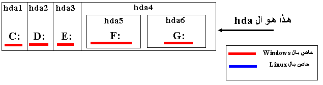 hda5 هو التقسيم الاول من نوع logical داخل البارتيشن hda4 والذي هو extended طبعا داخل القرص الصلب الاول hda