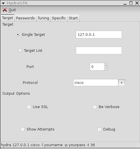 بعد إنتهاء عملية التركيب … لرؤية خيارات البرنامج الذي يعمل من الطرفية أكتب hydra فقط … ولتشغيل البرنامج صاحب الواجهة الرسومية نفذ xhydra فقط … ستظهر لك شاشة مثل هذه: