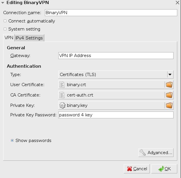الآن ضع أسم لهذا الإتصال مثلاً انا اخترت BinaryVPN ضع ما تريد انت. بعد ذلك قم بوضع الـ IP الخاص بالـ Gateway الذي ستشبك عليه، وقم بإختيار Certificates كما في الصورة وذلك لأنني أستعمل الشهادات. وأختر الشهادة الخاصة بالمستخدم الذي تريده، والشهادة الخاصة بالـ CA والمفتاح الخاص بك. وأخيراً ضع الكلمة السرية التي تستعملها للمفتاح، هذا إن كنت تستعمل كلمة سرية على المفتاح.