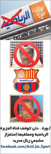 أرجوا من جميع محبي العدالة والإنصاف سواء للريال أو لأي نادي آخر أن يرفعوا هذه الشعار والحملة ضد الجزيرة … فاليكفوا عن هذا التجريح وهذا التزوير للحقائق والأرقام فلسنا أطفال ولا صغار العقول والأنترنت بات بسهولة لاي شخص أن يكتشف الحقيقة والواقع من خلاله بضغطات زر فقط ! ولدعم الحملة يرجى استعمال الإعلان التالي: