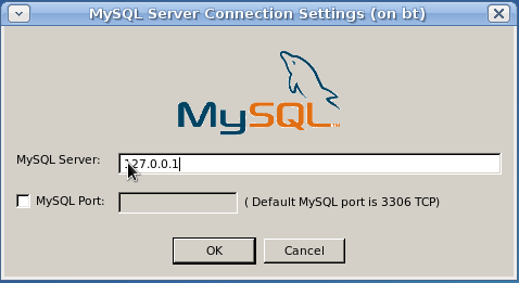 ستظهر لك شاشة تطلب منك تحديد أين يوجد خادم الـ MySQL، فكل ما عليك فعله في مثالنا هذا هو العنوان المحلي 127.0.0.1 ومن ثم الضغط على OK كما في الصورة: