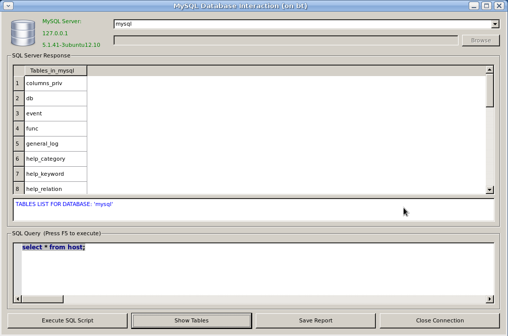 هكذا ستكون أتصلت بخادم الـ MySQL ممكن تضغط الآن على Show Tables بعد أن تقوم بإختيار قاعدة البيانات التي تريد عرض محتوياتها من الأعلى … في المثال أخترت mysql ومن ثم ضغطت على Show Tables كما في الصورة: