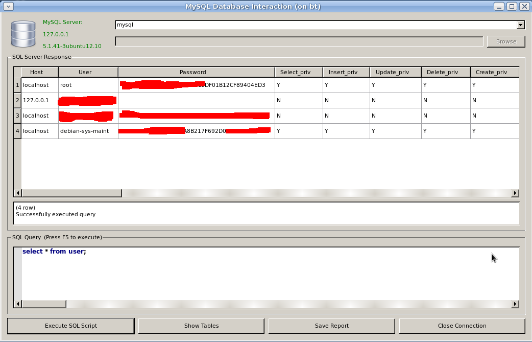 كذلك يمكنك تنفيذ عملياتك الخاصة، مثلاً عرض محتوى جدول المستخدمين … كل ما عليك فعله هو كتابة تعليمة الـ SQL ومن ثم الضغط على F5 لتنفيذها، كما في الصورة: