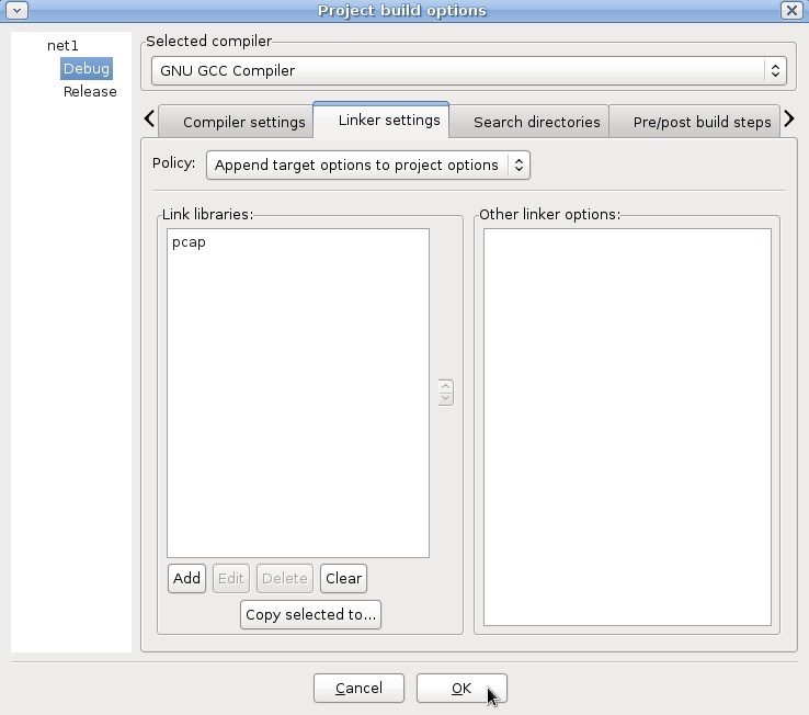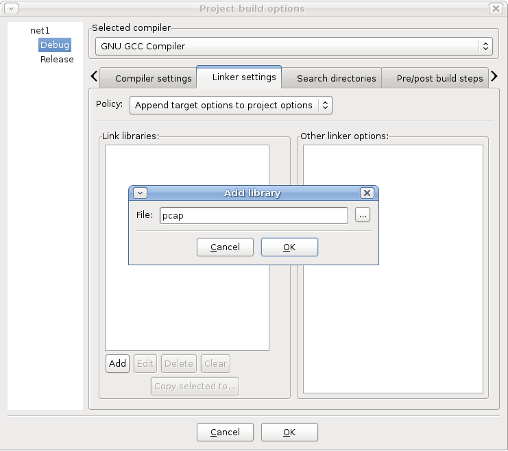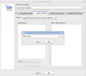بعد ذلك نتأكد من إختيارنا لـ Debug ونذهب الى صفحة Linker Settings ونقوم بإضافة المكتبة pcap … كل الذي عليك فعله هو الضغط على add ومن ثم كتابة pcap … هذا لأني أفترض إنك قمت بتركيب pcap حسب نظام الحزم لديك وتم وضعه في المسار الطبيعي للمكتبات … إن كنت قد قمت بتركيب pcap بشكل يدوي؟ عليك بإضافة المسار الكامل له … الصورة توضح العملية: