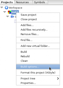 أنتهينا من الكلام، لنبدأ العمل … أول شيء نعمله هو إننا نريد أن نضيف المكتبة pcap الى الـ Linker وذلك ليتم ربطها مع البرنامج لحظة عمل Compile له … ويمكن عمل ذلك من خلال الضغط على إسم المشروع في CodeBlocks Workspace ومن ثم الذهاب الى Build Options … كما في الصورة: