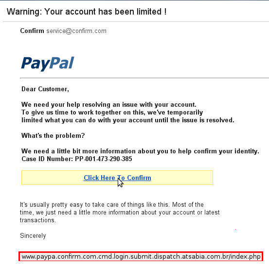هناك الكثير من الناس لا يعلمون عن هذه النوعية من الهجمات … ولاحظت ذلك من خلال تدريسي لاحدى مواد أمن المعلومات في الجامعة … الكثير يُسرق منه حسابه في الفيسبوك وتويتر والبريد ولم يُدرك بإن السبب هو أمثال هذا البريد الذي فيه رابط لموقع لا علاقة له حسب الصورة في PayPal … حيث قام بإخفاء الدومين الحقيقي من خلال إضافة الكثير من النطاقات الفرعية … طبعاً المسألة لا تحتاج الى إعجاز فكري ولا شيء … كل ما عليك فعله ببساطة هو وضع الفأرة فوق الرابط أو الصورة في بعض الأحيان التي تقودك الى الموقع … وتنظر في أسفل المتصفح في خانة Status Bar ما هو الرابط الذي سوف تزوره … يعني مثل هذا الرابط، ما هي علاقة Paypa بـ Paypal ؟ أو atsabia بـ PayPal ؟ رغم إن نص الرسالة رسمي بشكل كبير وربما مرت عليك سابقاً … لكن هذا لا يعني إن الرسالة حقيقية !!!