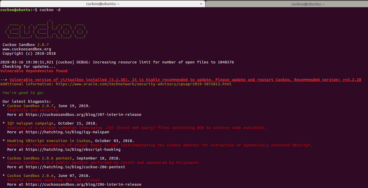 - Now let’s start playing with Cuckoo. Open one terminal with two tabs (or two separate terminals) and then in the first terminal type “cuckoo -d” as seen in figure 2.8. You can also see the ASCII art for the word “cuckoo” with the version number of Cuckoo we are running.
