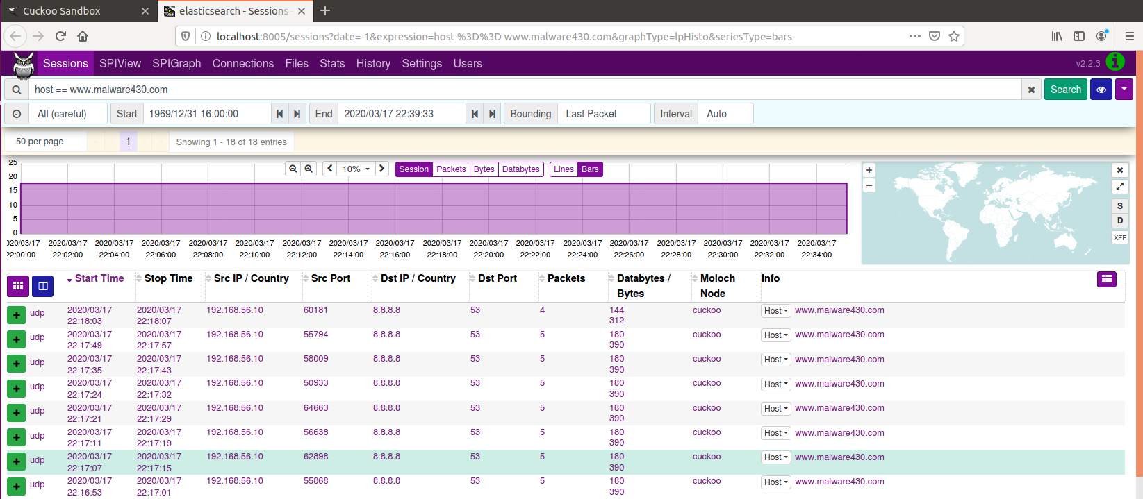 - Now some might be saying where is the Moloch part that you said it’s integrated? Well just click on any of the URLs or IP Addresses and it will send you to Moloch with a filter applied for that Domain/IP Address as seen in figure 3.5.