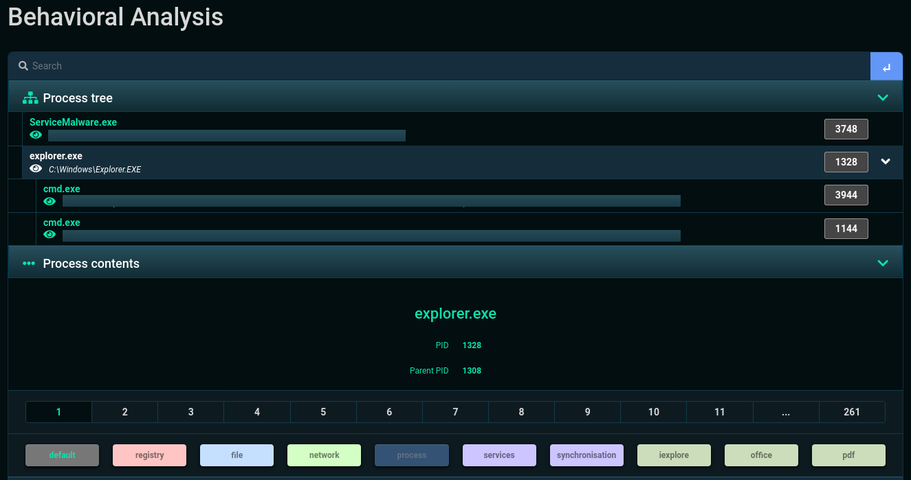 - If you go to the Behavioral Analysis page, you should be able to see the behavior recorded by Cuckoo for you as seen in figure 3.7. The buttons default, registry, file, network, etc allow you to focus on one specific artifact, which is very useful for focusing in specific artifacts.