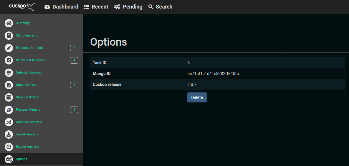 - Now, if let’s say you want to delete the sample, all you need to do is go to the Options page and click the Delete button, as seen in figure 3.8. This will delete the sample from your Cuckoo Sandbox repository (your call!).