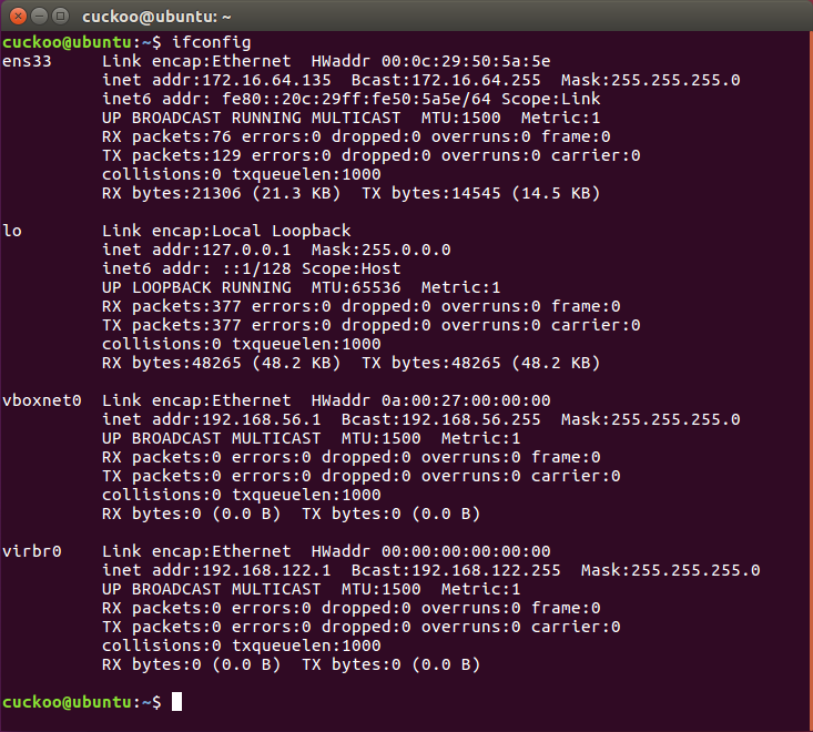 Before we start Cuckoo, I just want to show you how internally the VM is configured. If you check figure 2.5, you can see the network configuration for both ens33 (interface using NAT by Ubuntu system) and vboxnet0 (interface used by VMs). The Windows 7 VM inside is using a host-only network as seen in figure 2.6.