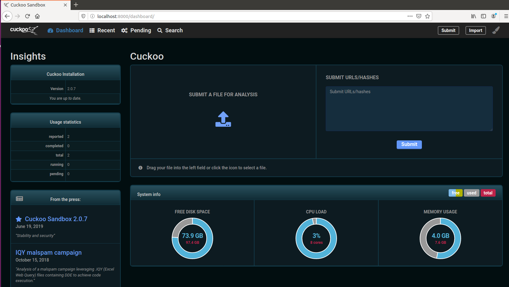 - Click on the URL seen in figure 1.10 to open Firefox with the main web interface of Cuckoo as seen in figure 2.10.