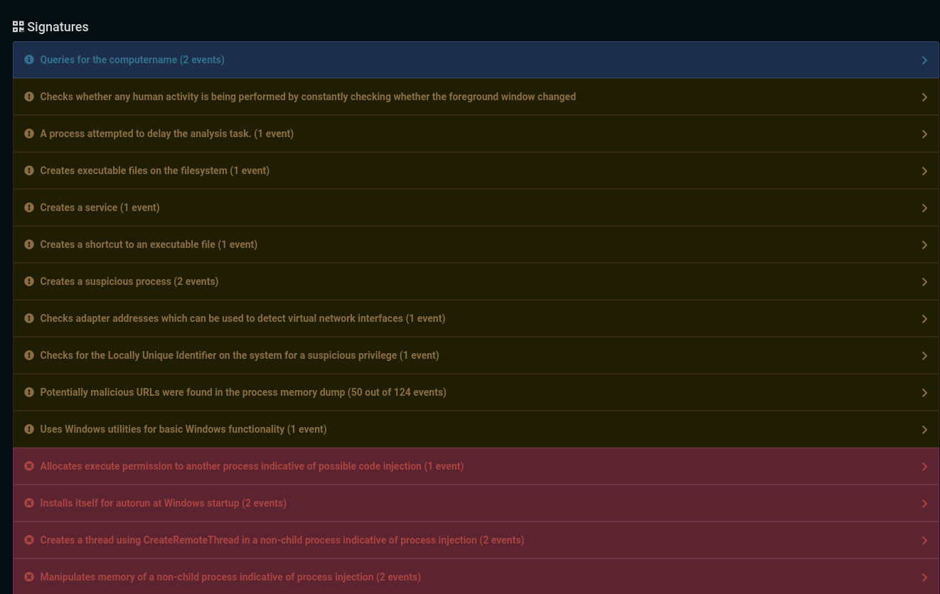 - If you check below Signature as seen in figure 3.3, you should see a couple of the signatures that Cuckoo determined from the analysis. Please note that these could be different from one sample to another, again I’m only showing a sample.